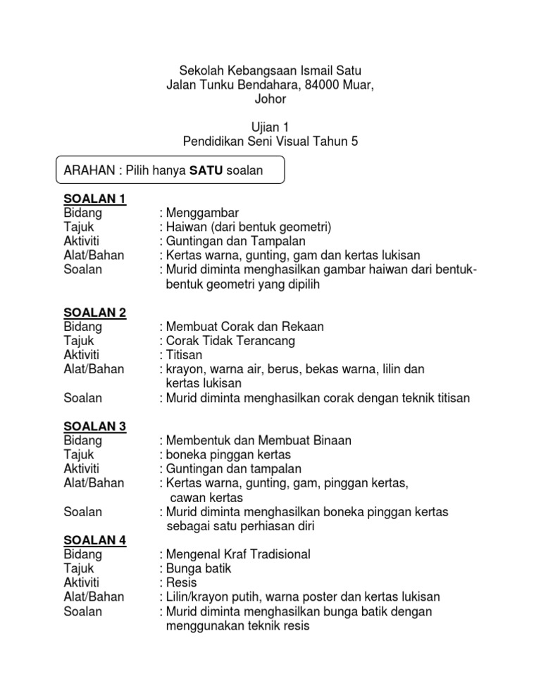 Kertas Soalan Pendidikan Seni Visual Tahun 5 Kssr